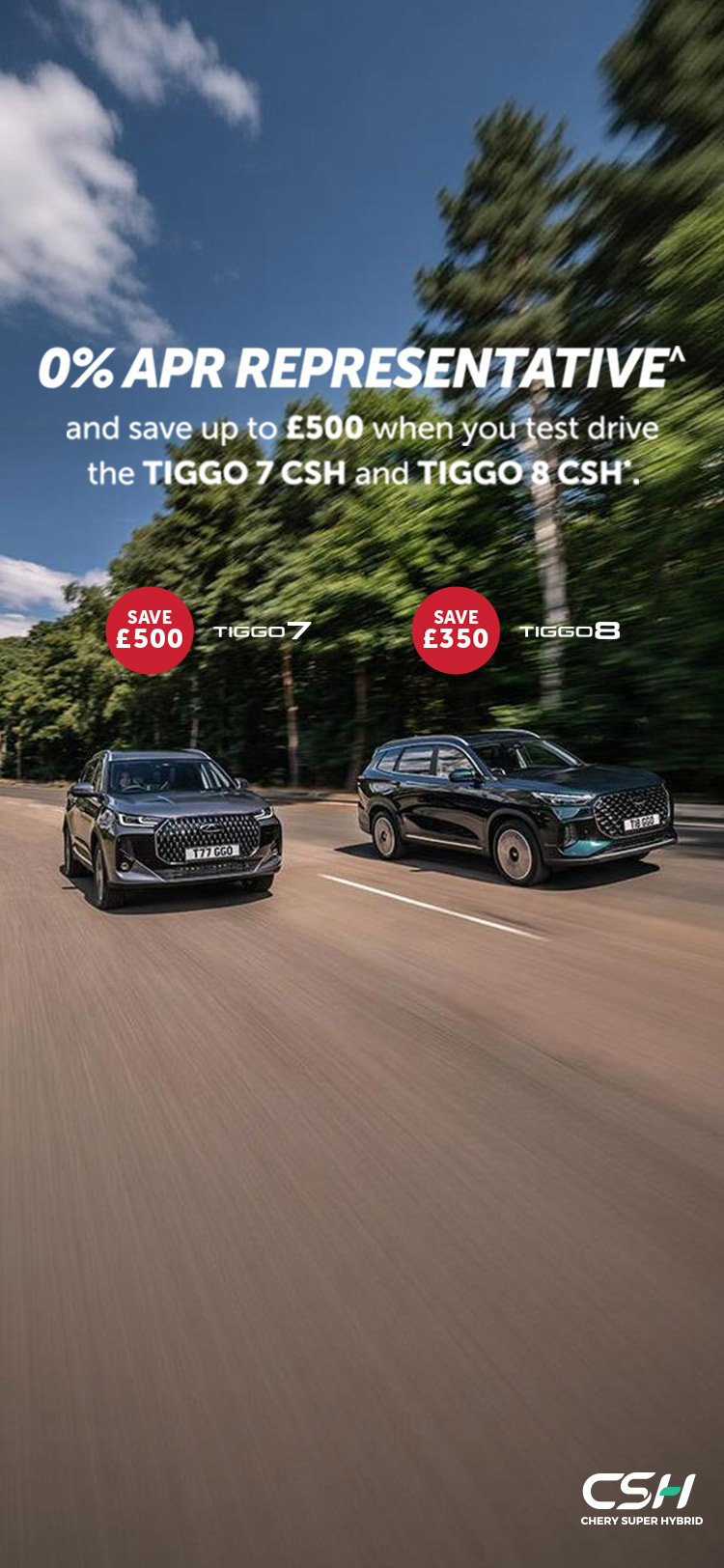^0% APR Representative on Chery TIGGO 7 CSH and TIGGO 8 CSH models.