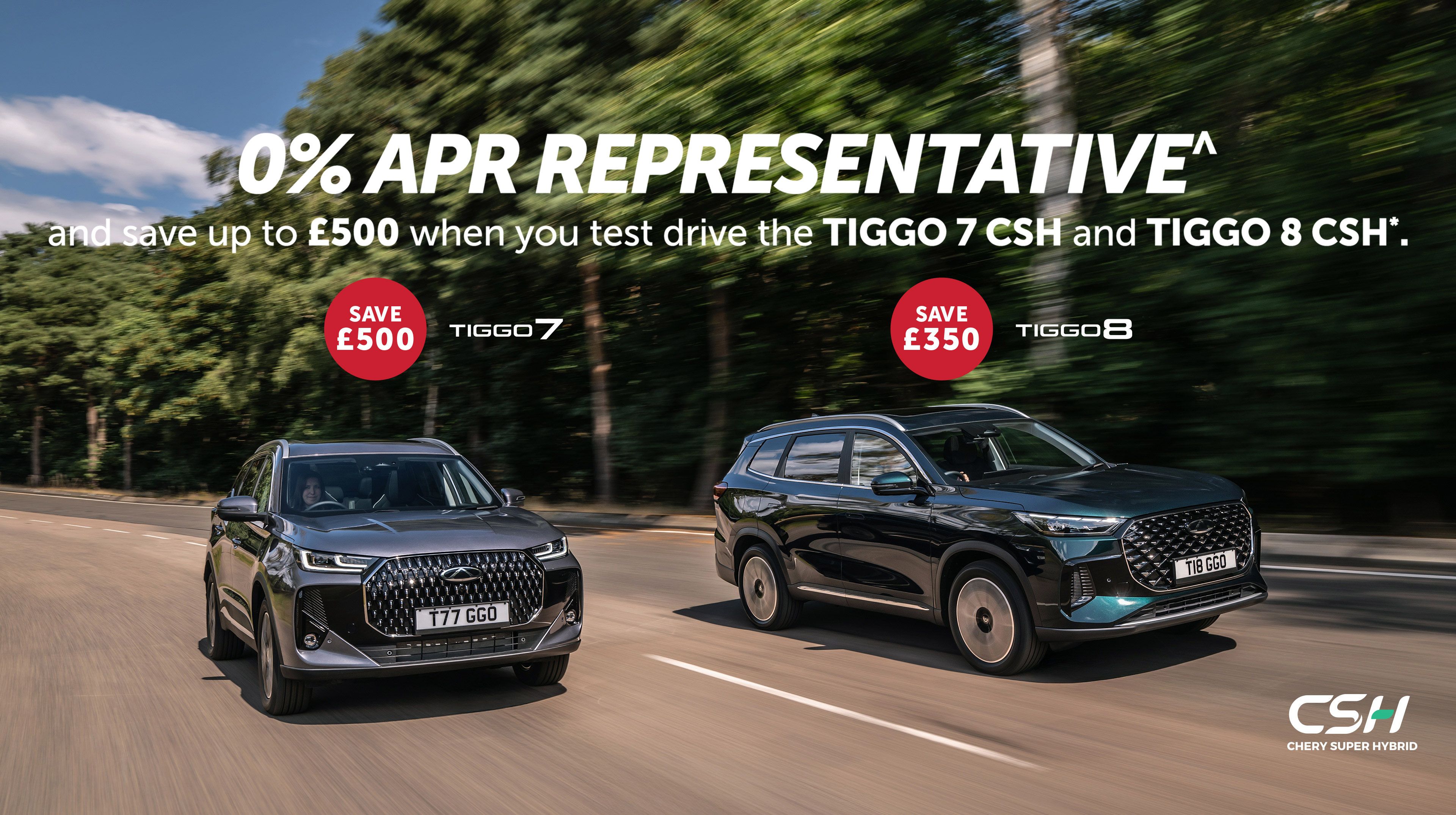 ^0% APR Representative on Chery TIGGO 7 CSH and TIGGO 8 CSH models.